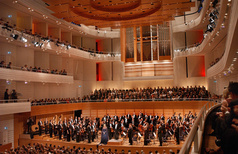 The Concert Hall area is characterised by its opacity (lack of translucency) and thus stands in stark contrast to the convention area. Nouvel used unusual colours like garnet red, deep green and midnight blue for this part of the venue. The outer walls of the Concert Hall are clad in wood. The curved shape of this outer wall pushes into the angular Foyer and is deliberately reminiscent of a cello case.